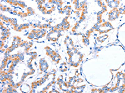 The image on the left is immunohistochemistry of paraffin-embedded Human thyroid cancer tissue using CSB-PA957686(ACADS Antibody) at dilution 1/20, on the right is treated with fusion protein. (Original magnification: ×200)