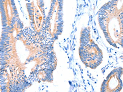The image on the left is immunohistochemistry of paraffin-embedded Human colon cancer tissue using CSB-PA957686(ACADS Antibody) at dilution 1/20, on the right is treated with fusion protein. (Original magnification: ×200)