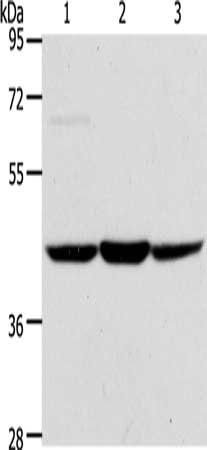Gel: 10%SDS-PAGE, Lysate: 40 μg, Lane 1-3: Human liver cancer tissue, rat kidney tissue, human fetal liver tissue, Primary antibody: CSB-PA957686(ACADS Antibody) at dilution 1/400, Secondary antibody: Goat anti rabbit IgG at 1/8000 dilution, Exposure time: 90 seconds
