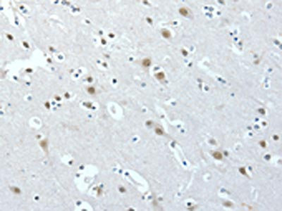 The image on the left is immunohistochemistry of paraffin-embedded Human brain tissue using CSB-PA056430(ACLY Antibody) at dilution 1/40, on the right is treated with fusion protein. (Original magnification: ×200)