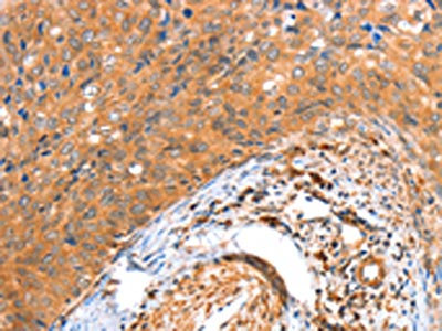 The image on the left is immunohistochemistry of paraffin-embedded Human cervical cancer tissue using CSB-PA975419(ACOX3 Antibody) at dilution 1/35, on the right is treated with fusion protein. (Original magnification: ×200)