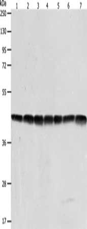 • Gel: 10%SDS-PAGE, Lysate: 40 μg, Lane 1-7: Hela cells, Jurkat cells, NIH/3T3 cells, human fetal liver tissue, mouse brain tissue, A431 cells, 293T cells, Primary antibody: CSB-PA244513(ACTB Antibody) at dilution 1/600, Secondary antibody: Goat anti rabbit IgG at 1/8000 dilution, Exposure time: 7 seconds