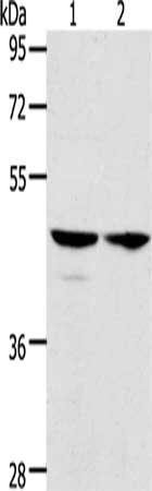 Gel: 10%SDS-PAGE, Lysate: 40 μg, Lane 1-2: Hela cells, A549 cells, Primary antibody: CSB-PA641289(ACTL8 Antibody) at dilution 1/350, Secondary antibody: Goat anti rabbit IgG at 1/8000 dilution, Exposure time: 5 seconds