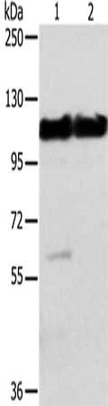 Gel: 6%SDS-PAGE, Lysate: 40 μg, Lane 1-2: Mouse heart tissue, Mouse muscle tissue, Primary antibody: CSB-PA828857(ACTN2 Antibody) at dilution 1/200, Secondary antibody: Goat anti rabbit IgG at 1/8000 dilution, Exposure time: 20 seconds