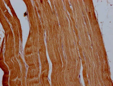 IHC image of CSB-PA001242LA11HU diluted at 1:500 and staining in paraffin-embedded human skeletal muscle tissue performed on a Leica BondTM system. After dewaxing and hydration, antigen retrieval was mediated by high pressure in a citrate buffer (pH 6.0). Section was blocked with 10% normal goat serum 30min at RT. Then primary antibody (1% BSA) was incubated at 4°C overnight. The primary is detected by a Goat anti-rabbit polymer IgG labeled by HRP and visualized using 0.05% DAB.