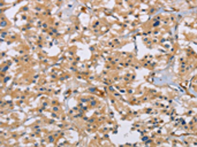 The image on the left is immunohistochemistry of paraffin-embedded Human thyroid cancer tissue using CSB-PA070925(ACTN4 Antibody) at dilution 1/60, on the right is treated with fusion protein. (Original magnification: ×200)