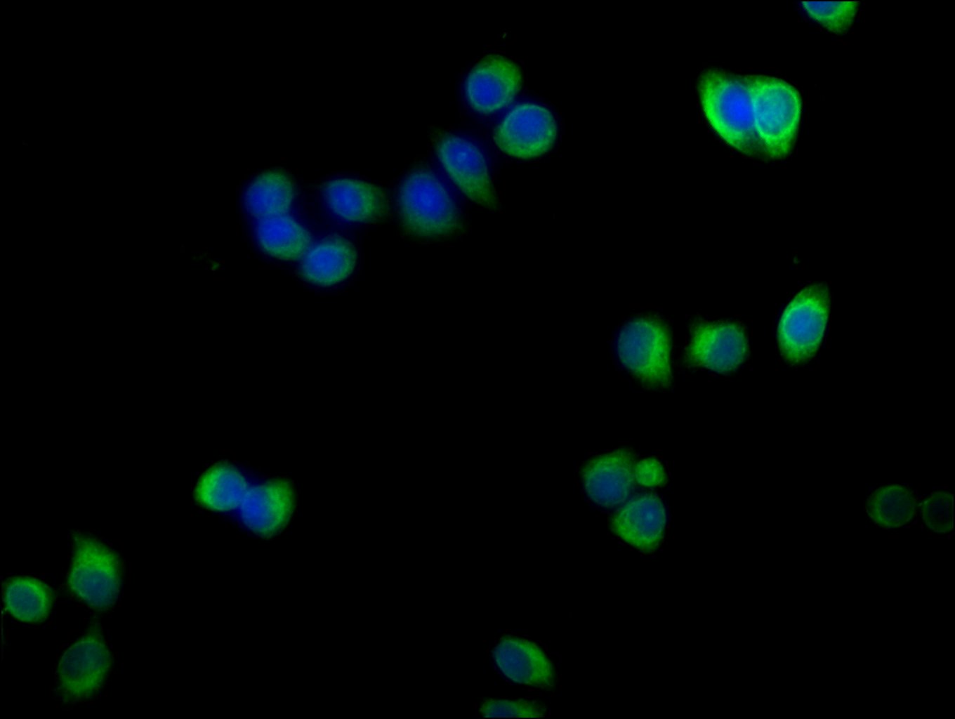 Immunofluorescence staining of PC-3 cells with CSB-PA001255LA01HU at 1:100,counter-stained with DAPI. The cells were fixed in 4% formaldehyde, permeabilized using 0.2% Triton X-100 and blocked in 10% normal Goat Serum. The cells were then incubated with the antibody overnight at 4°C.The secondary antibody was Alexa Fluor 488-congugated AffiniPure Goat Anti-Rabbit IgG (H+L).