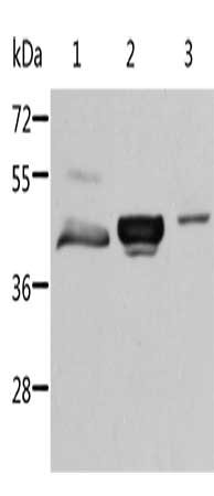 Gel: 10%SDS-PAGE, Lysate: 40 μg, Lane 1-3: Mouse kidney tissue, human normal kidney tissue, K562 cells, Primary antibody: CSB-PA287728(ACY1 Antibody) at dilution 1/200, Secondary antibody: Goat anti rabbit IgG at 1/8000 dilution, Exposure time: 1 minute