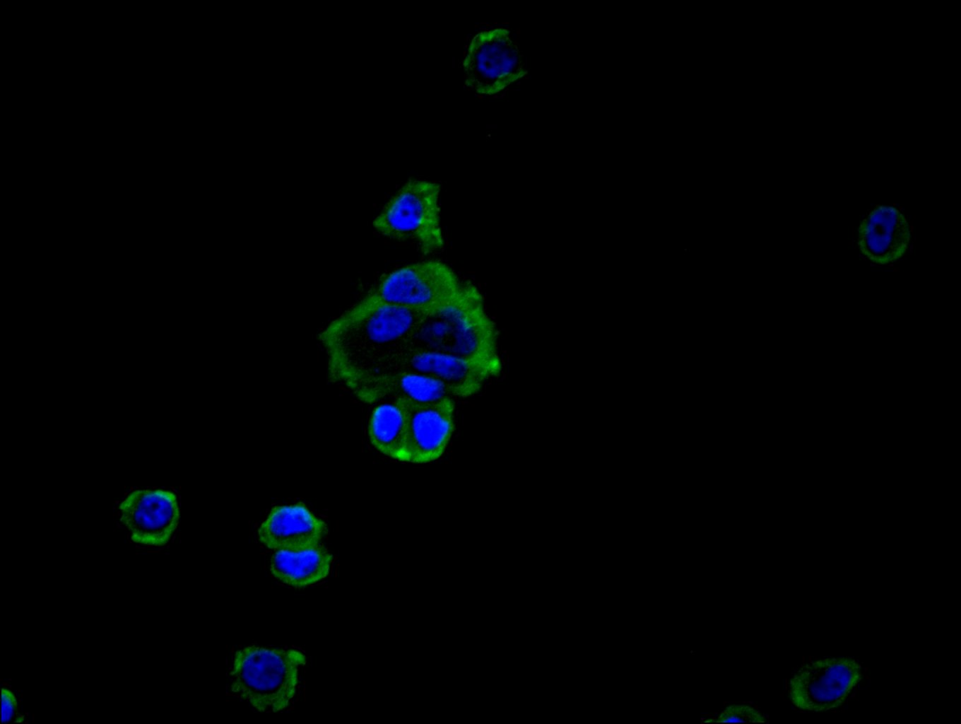 ImmunofluorescencestainingofMCF-7cellwith5%goatserum,counter-stainedwithDAPI.Thecellswerefixedin4%formaldehydeandblockedin10%normalGoatSerum.Thecellswerethenincubatedwiththeantibodyovernightat4C.ThesecondaryantibodywasAlexaFluor488-congugatedAffiniPureGoatAnti-RabbitIgG(H+L).