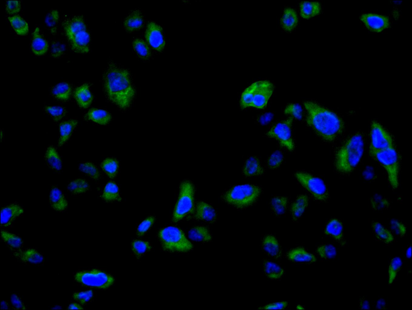 Immunofluorescence staining of MCF-7 cell with CSB-PA10259A0Rb at 1:30, counter-stained with DAPI. The cells were fixed in 4% formaldehyde and blocked in 10% normal Goat Serum. The cells were then incubated with the antibody overnight at 4C. The secondary antibody was Alexa Fluor 488-congugated AffiniPure Goat Anti-Rabbit IgG(H+L).
