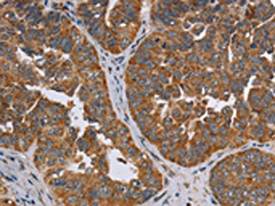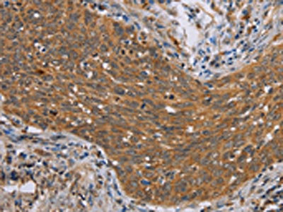 • The image on the left is immunohistochemistry of paraffin-embedded Human cervical cancer tissue using CSB-PA582168(ADAMTS15 Antibody) at dilution 1/60, on the right is treated with fusion protein. (Original magnification: ×200)