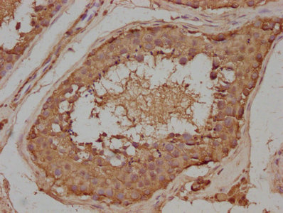 • IHC image of CSB-PA839393LA01HU diluted at 1:100 and staining in paraffin-embedded human testis tissue performed on a Leica BondTM system. After dewaxing and hydration, antigen retrieval was mediated by high pressure in a citrate buffer (pH 6.0). Section was blocked with 10% normal goat serum 30min at RT. Then primary antibody (1% BSA) was incubated at 4°C overnight. The primary is detected by a biotinylated secondary antibody and visualized using an HRP conjugated SP system.