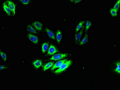 • Immunofluorescent analysis of HepG2 cells using CSB-PA808998LA01HU at dilution of 1:100 and Alexa Fluor 488-congugated AffiniPure Goat Anti-Rabbit IgG(H+L)