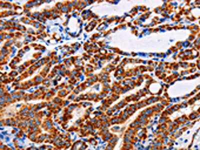 • The image on the left is immunohistochemistry of paraffin-embedded Human thyroid cancer tissue using CSB-PA235954(ADH1A Antibody) at dilution 1/25, on the right is treated with fusion protein. (Original magnification: ×200)
