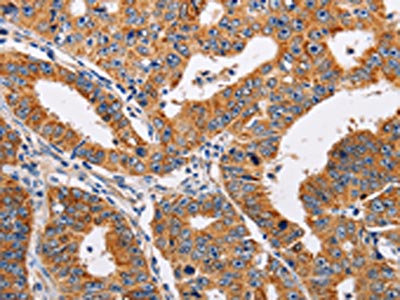 • The image on the left is immunohistochemistry of paraffin-embedded Human gastic cancer tissue using CSB-PA235954(ADH1A Antibody) at dilution 1/25, on the right is treated with fusion protein. (Original magnification: ×200)