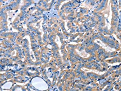 The image on the left is immunohistochemistry of paraffin-embedded Human thyroid cancer tissue using CSB-PA408174(ADH4 Antibody) at dilution 1/25, on the right is treated with fusion protein. (Original magnification: ×200)