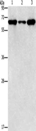 • Gel: 10%SDS-PAGE, Lysate: 40 μg, Lane 1-3: PC3 cells, A549 cells, K562 cells, Primary antibody: CSB-PA017442(ADRA1A Antibody) at dilution 1/300, Secondary antibody: Goat anti rabbit IgG at 1/8000 dilution, Exposure time: 30 seconds