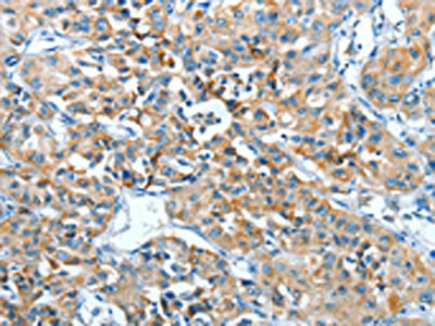 The image on the left is immunohistochemistry of paraffin-embedded Human liver cancer tissue using CSB-PA698673(ADRA1B Antibody) at dilution 1/25, on the right is treated with synthetic peptide. (Original magnification: ×200)