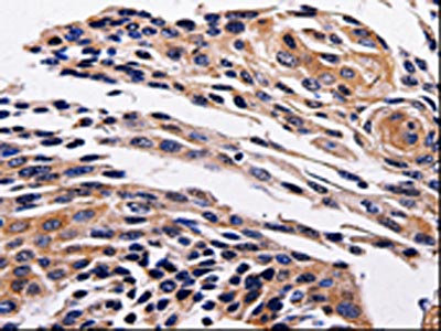 The image is immunohistochemistry of paraffin-embedded Human cervical cancer tissue using CSB-PA038144(ADRB1 Antibody) at dilution 1/25. (Original magnification: ×200)