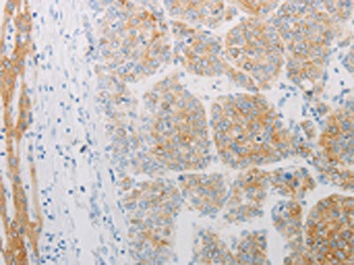 The image on the left is immunohistochemistry of paraffin-embedded Human liver cancer tissue using CSB-PA211297(ADRB2 Antibody) at dilution 1/20, on the right is treated with synthetic peptide. (Original magnification: ×200)