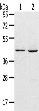 Gel: 8%SDS-PAGE,Lysate: 40 μg,Lane 1-2: HepG2 cells, Hela cells,Primary antibody: CSB-PA831980(ADRB3 Antibody) at dilution 1/200 dilution,Secondary antibody: Goat anti rabbit IgG at 1/8000 dilution,Exposure time: 20 seconds