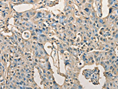 The image on the left is immunohistochemistry of paraffin-embedded Human gastric cancer tissue using CSB-PA197217(AGBL2 Antibody) at dilution 1/25, on the right is treated with fusion protein. (Original magnification: ×200)