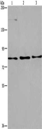 • Gel: 6%SDS-PAGE, Lysate: 40 μg, Lane 1-3: Raji cells, 293T cells, PC3 cells, Primary antibody: CSB-PA977504(AGO4 Antibody) at dilution 1/450, Secondary antibody: Goat anti rabbit IgG at 1/8000 dilution, Exposure time: 1 minute