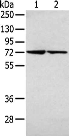 • Gel: 8%SDS-PAGE, Lysate: 40 μg, Lane 1-2: 231 and 293T cell, Primary antibody: CSB-PA043528(AGPS Antibody) at dilution 1/200 dilution, Secondary antibody: Goat anti rabbit IgG at 1/8000 dilution, Exposure time: 5 seconds