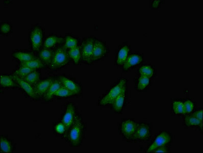 • Immunofluorescent analysis of HepG2 cells using CSB-PA06369A0Rb at dilution of 1:100 and Alexa Fluor 488-congugated AffiniPure Goat Anti-Rabbit IgG(H+L)