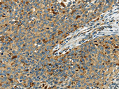 • The image on the left is immunohistochemistry of paraffin-embedded Human cervical cancer tissue using CSB-PA149571(AIF1 Antibody) at dilution 1/40, on the right is treated with fusion protein. (Original magnification: ×200)