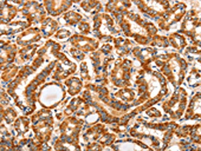 The image on the left is immunohistochemistry of paraffin-embedded Human thyroid cancer tissue using CSB-PA858560(AIM2 Antibody) at dilution 1/60, on the right is treated with fusion protein. (Original magnification: ×200)