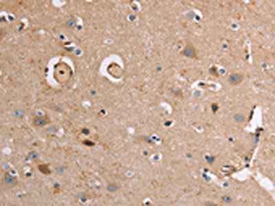 The image on the left is immunohistochemistry of paraffin-embedded Human brain tissue using CSB-PA298726(AKR1B10 Antibody) at dilution 1/20, on the right is treated with fusion protein. (Original magnification: ×200)