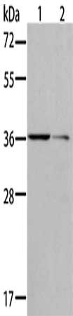 Gel: 10%SDS-PAGE, Lysate: 40 μg, Lane 1-2: Raji cells, Jurkat cells, Primary antibody: CSB-PA298726(AKR1B10 Antibody) at dilution 1/175, Secondary antibody: Goat anti rabbit IgG at 1/8000 dilution, Exposure time: 10 seconds