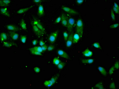 Immunofluorescence staining of Hela cells with CSB-PA15905A0Rb at 1:200, counter-stained with DAPI. The cells were fixed in 4% formaldehyde, permeabilized using 0.2% Triton X-100 and blocked in 10% normal Goat Serum. The cells were then incubated with the antibody overnight at 4°C. The secondary antibody was Alexa Fluor 488-congugated AffiniPure Goat Anti-Rabbit IgG(H+L).