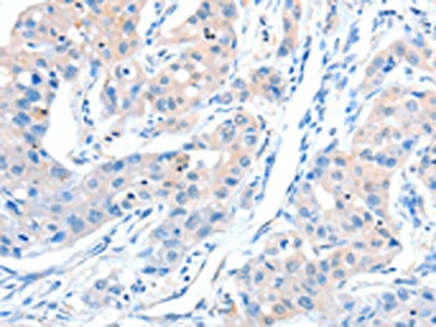 The image on the left is immunohistochemistry of paraffin-embedded Human lung cancer tissue using CSB-PA983294(AKT3 Antibody) at dilution 1/30, on the right is treated with synthetic peptide. (Original magnification: ×200)