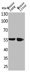 • Western Blot analysis of mouse lung mouse liver cells using ALDH1A1 Polyclonal Antibody