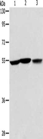 Gel: 8%SDS-PAGE, Lysate: 40 μg, Lane 1-3: Human fetal liver tissue, hela cells, Human fetal kidney tissue, Primary antibody: CSB-PA779355(ALDH9A1 Antibody) at dilution 1/225, Secondary antibody: Goat anti rabbit IgG at 1/8000 dilution, Exposure time: 30 seconds