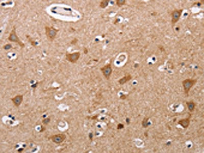 The image on the left is immunohistochemistry of paraffin-embedded Human brain tissue using CSB-PA131441(ALG9 Antibody) at dilution 1/60, on the right is treated with fusion protein. (Original magnification: ×200)