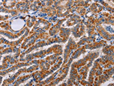 The image on the left is immunohistochemistry of paraffin-embedded Human thyroid cancer tissue using CSB-PA131441(ALG9 Antibody) at dilution 1/60, on the right is treated with fusion protein. (Original magnification: ×200)