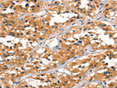 The image on the left is immunohistochemistry of paraffin-embedded Human thyroid cancer tissue using CSB-PA624049(ALOX15 Antibody) at dilution 1/60, on the right is treated with synthetic peptide. (Original magnification: ×200)