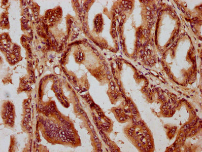 • IHC image of CSB-PA12639A0Rb diluted at 1:1400 and staining in paraffin-embedded human prostate tissue performed on a Leica BondTM system. After dewaxing and hydration, antigen retrieval was mediated by high pressure in a citrate buffer (pH 6.0). Section was blocked with 10% normal goat serum 30min at RT. Then primary antibody (1% BSA) was incubated at 4°C overnight. The primary is detected by a biotinylated secondary antibody and visualized using an HRP conjugated SP system.