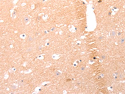 The image on the left is immunohistochemistry of paraffin-embedded Human brain tissue using CSB-PA960464(AMH Antibody) at dilution 1/25, on the right is treated with synthetic peptide. (Original magnification: ×200)