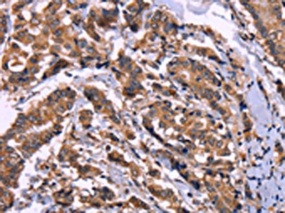 The image on the left is immunohistochemistry of paraffin-embedded Human breast cancer tissue using CSB-PA555803(AMIGO2 Antibody) at dilution 1/50, on the right is treated with fusion protein. (Original magnification: ×200)