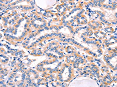 The image on the left is immunohistochemistry of paraffin-embedded Human thyroid cancer tissue using CSB-PA201757(AMY2A Antibody) at dilution 1/50, on the right is treated with fusion protein. (Original magnification: ×200)