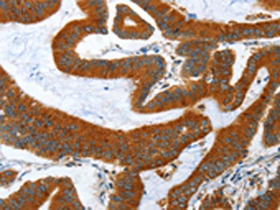 • The image on the left is immunohistochemistry of paraffin-embedded Human colon cancer tissue using CSB-PA005512(ANAPC10 Antibody) at dilution 1/40, on the right is treated with fusion protein. (Original magnification: ×200)
