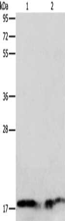 • Gel: 12%SDS-PAGE, Lysate: 40 μg, Lane 1-2: Human normal liver tissue, Human fetal liver tissue, Primary antibody: CSB-PA071857(ANG Antibody) at dilution 1/133, Secondary antibody: Goat anti rabbit IgG at 1/8000 dilution, Exposure time: 20 seconds