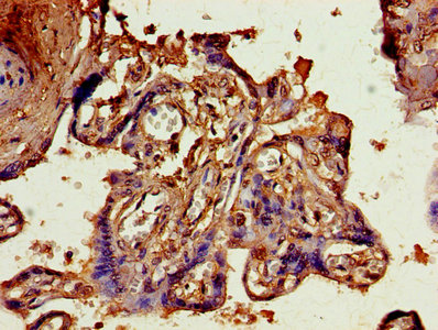 IHC image of CSB-PA05749A0Rb diluted at 1:800 and staining in paraffin-embedded human placenta tissue performed on a Leica BondTM system. After dewaxing and hydration, antigen retrieval was mediated by high pressure in a citrate buffer (pH 6.0). Section was blocked with 10% normal goat serum 30min at RT. Then primary antibody (1% BSA) was incubated at 4°C overnight. The primary is detected by a biotinylated secondary antibody and visualized using an HRP conjugated SP system.