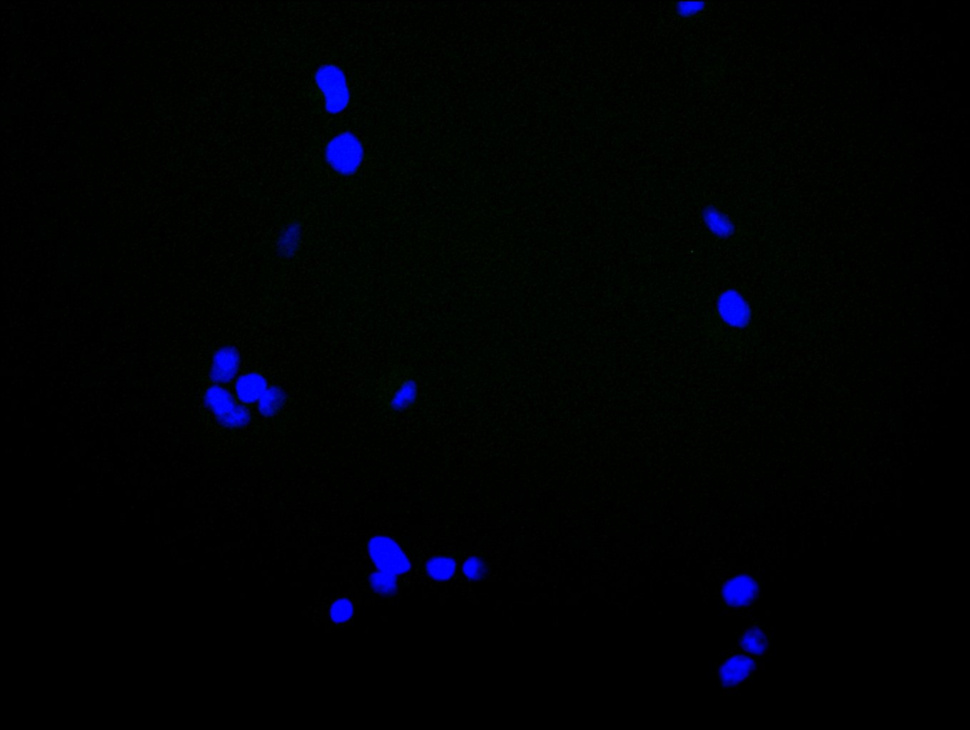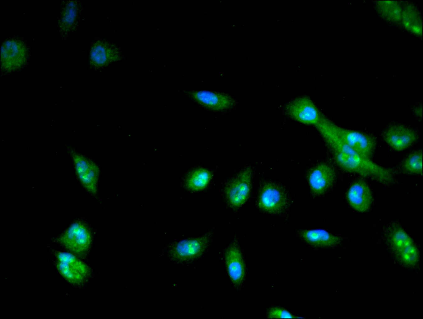 • Immunofluorescence staining of U251 cell with CSB-PA757769LA01HU at 1:450, counter-stained with DAPI. The cells were fixed in 4% formaldehyde and blocked in 10% normal Goat Serum. The cells were then incubated with the antibody overnight at 4C. The secondary antibody was Alexa Fluor 488-congugated AffiniPure Goat Anti-Rabbit IgG(H+L).