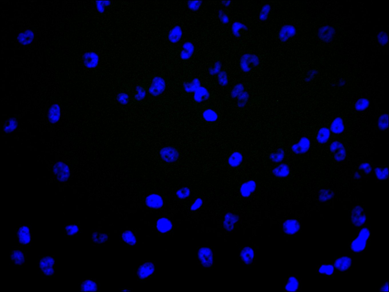 • Immunofluorescence staining of U251 cell with 5% goat serum, counter-stained with DAPI. The cells were fixed in 4% formaldehyde and blocked in 10% normal Goat Serum. The cells were then incubated with the antibody overnight at 4C. The secondary antibody was Alexa Fluor 488-congugated AffiniPure Goat Anti-Rabbit IgG(H+L).