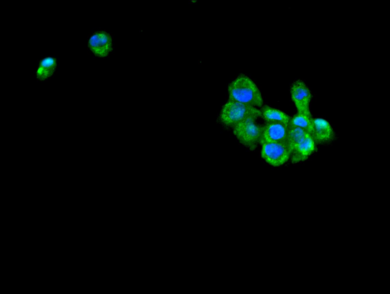 • Immunofluorescence staining of A431 cell with CSB-PA757769LA01HU at 1:450, counter-stained with DAPI. The cells were fixed in 4% formaldehyde and blocked in 10% normal Goat Serum. The cells were then incubated with the antibody overnight at 4C. The secondary antibody was Alexa Fluor 488-congugated AffiniPure Goat Anti-Rabbit IgG(H+L).